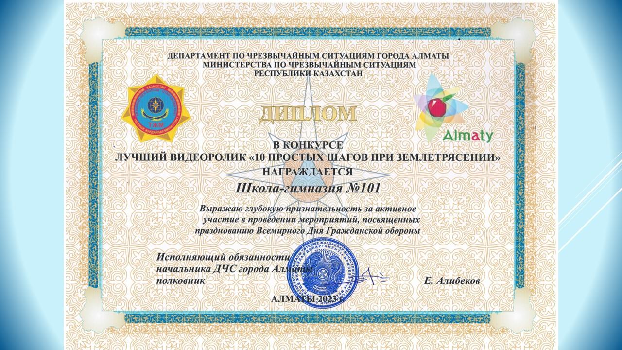 Дүниежүзілік Азаматтық қорғаныс күніне орай «Тәуекелдерді бағалаудағы ақпараттық технологиялардың рөлі» ұранымен өткізілген ақпараттық-насихаттау іс-шараларында Алматы қаласы Білім басқармасының «№101 мектеп-гимназиясы» «ЕҢ ҮЗДІК БЕЙНЕРОЛИК: ЖЕРСІЛКІНІСІ КЕЗІНДЕГІ 10 ҚАДАМ» ҚАЛАЛЫҚ байқауында жеңіске жеткені үшін дипломмен марапатталды. ҚҰТТЫҚТАЙМЫЗ!!!