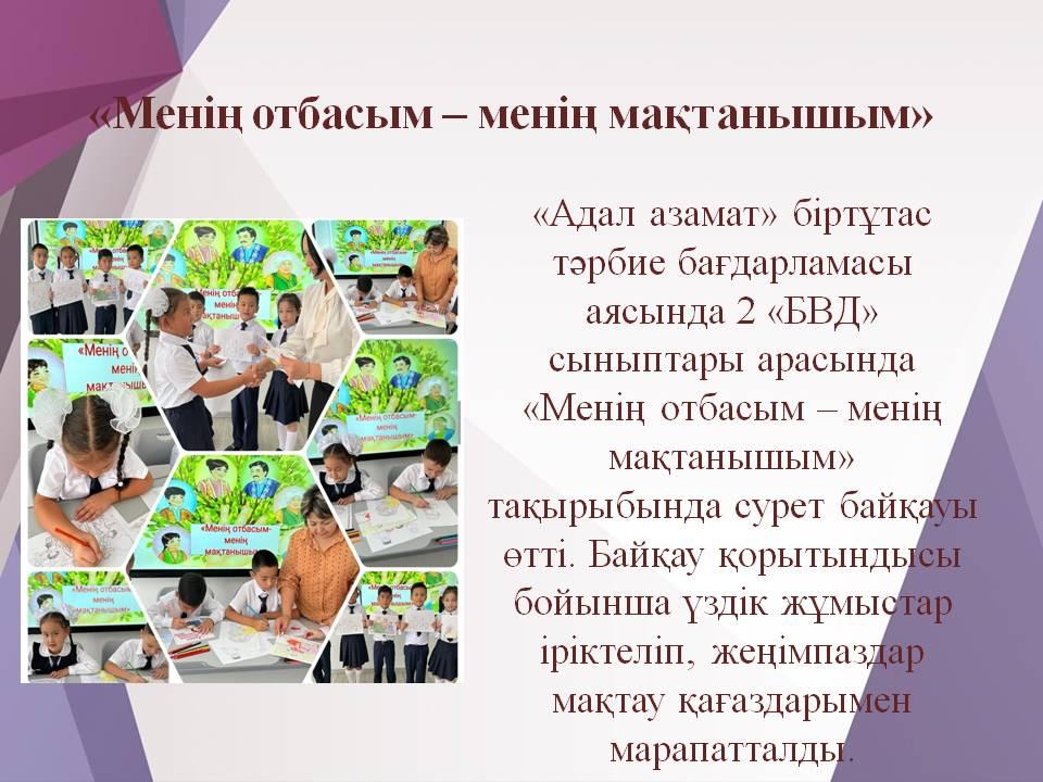 10 қыркүйек 2025 0 1 2 3 4 5 «Менің отбасым – менің мақтанышым» «Адал азамат» біртұтас тәрбие бағдарламасы аясында 2 «БВД» сыныптары арасында «Менің отбасым – менің мақтанышым» тақырыбында сурет байқауы өтті. Байқау қорытындысы бойынша үздік жұмыстар іріктеліп, жеңімпаздар мақтау қағаздарымен марапатталды.