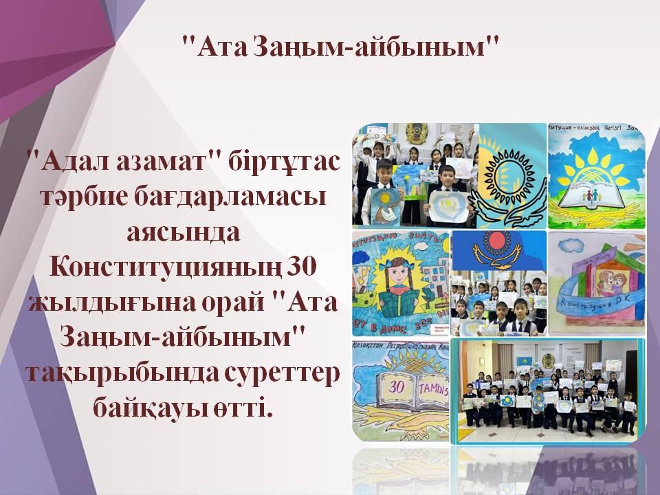 15 қыркүйек 2025 0 1 2 3 4 5 "Ата Заңым-айбыным" "Адал азамат" біртұтас тәрбие бағдарламасы аясында Конституцияның 30 жылдығына орай "Ата Заңым-айбыным" тақырыбында суреттер байқауы өтті.