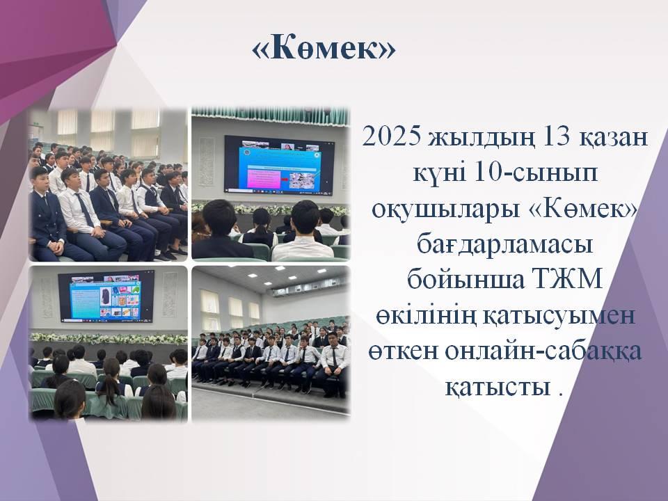 20 қазан 2025 0 1 2 3 4 5 «Көмек» 2025 жылдың 13 қазан күні 10-сынып оқушылары «Көмек» бағдарламасы бойынша ТЖМ өкілінің қатысуымен өткен онлайн-сабаққа қатысты .