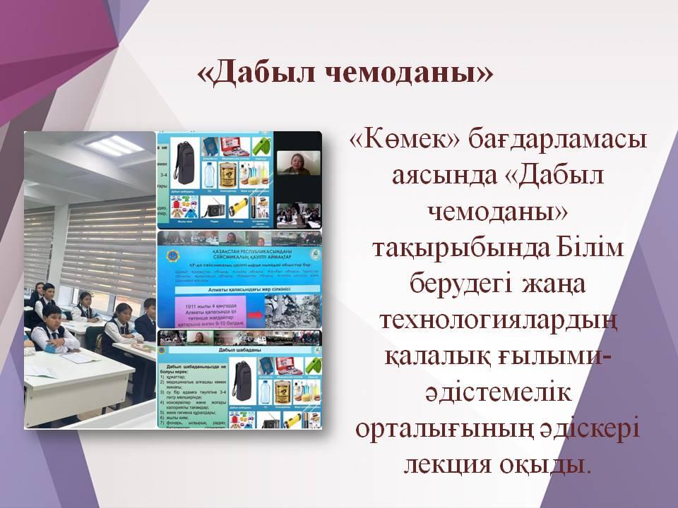 «Көмек» бағдарламасы аясында «Дабыл чемоданы» тақырыбында Білім берудегі жаңа технологиялардың қалалық ғылыми-әдістемелік орталығының әдіскері лекция оқыды.