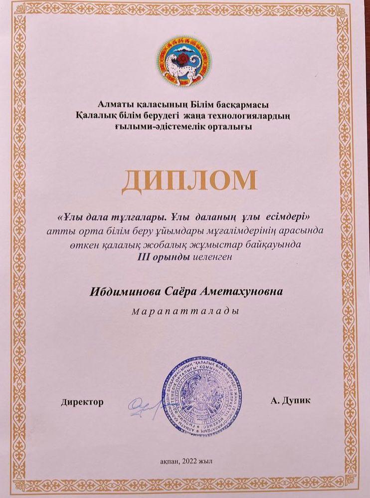 Алматы қаласы Білім басқармасының Қалалық білім берудегі жаңа технологиялардың ғылыми-әдістемелік орталығының “Ұлы дала тұлғалары. Ұлы даланың ұлы есімдері” тақырыбындағы ғылыми-тәжірибиелік конференция - мұғалімдердің жобалық жұмыстарының қалалық байқауында, математика бағыты бойынша #101 мектеп-гимназияның мұғалімі Ибдиминова Саера жүлделі ІІІ орынға ие болды.