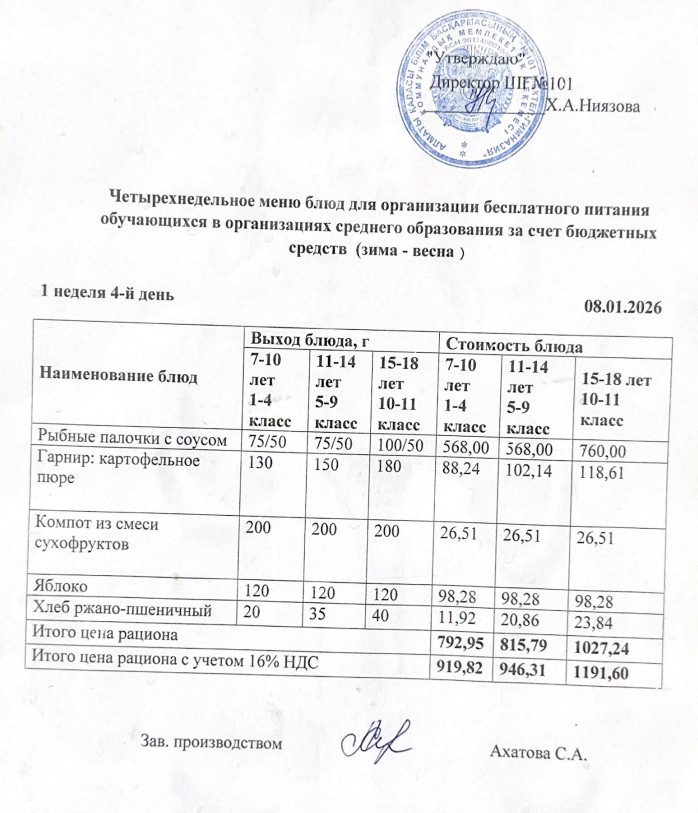 Қаңтар айы 1 апта 4-күн ас мәзірі. » КГУ "Школа-гимназия №101" Управления образования г.Алматы
