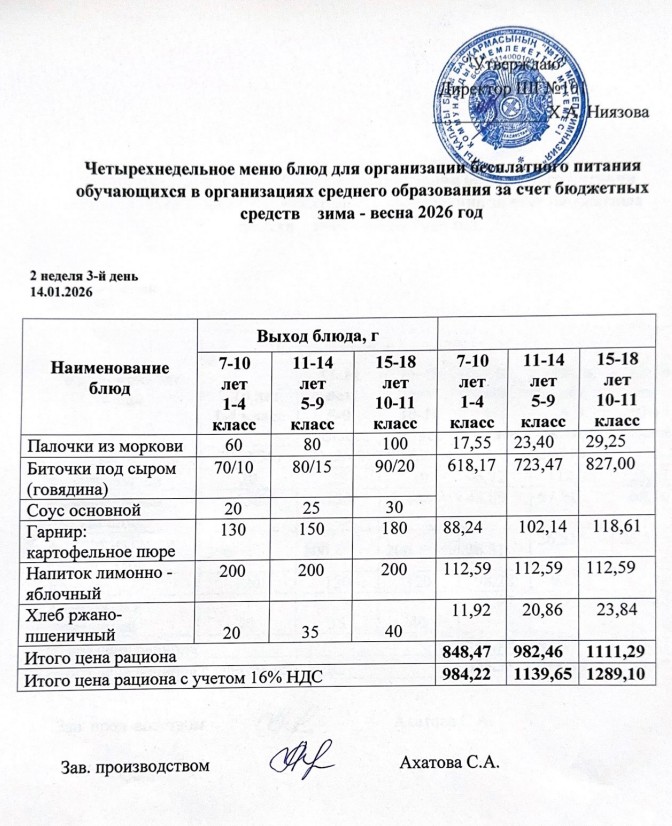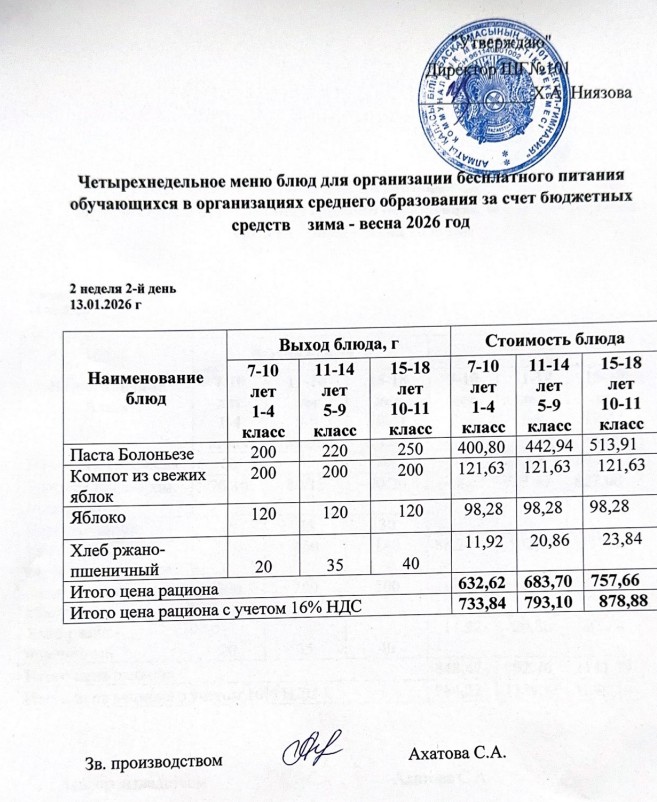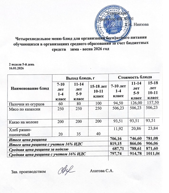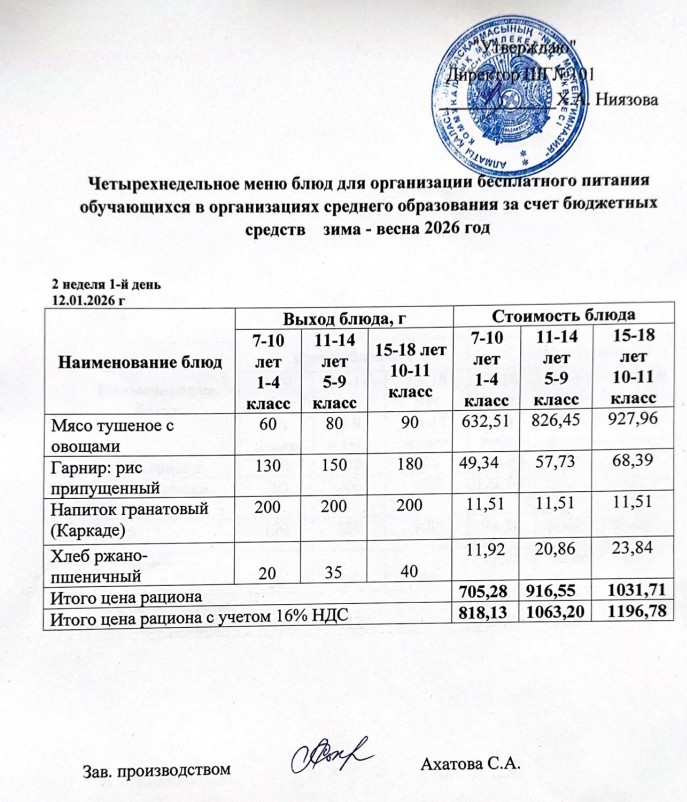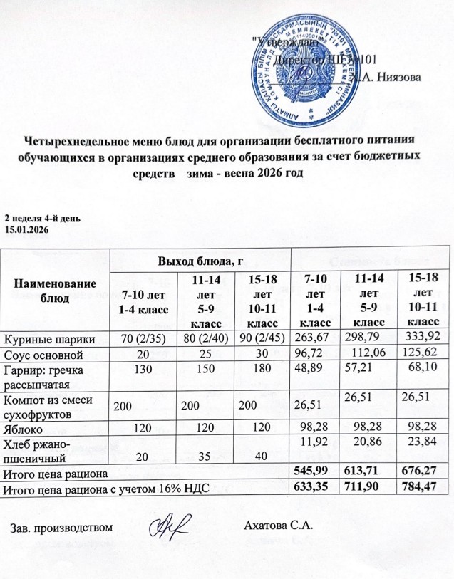 Ас мәзірі 12.01.-16.01.2026ж » КГУ "Школа-гимназия №101" Управления образования г.Алматы