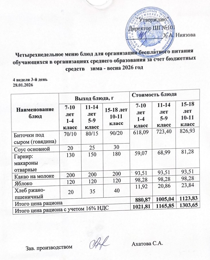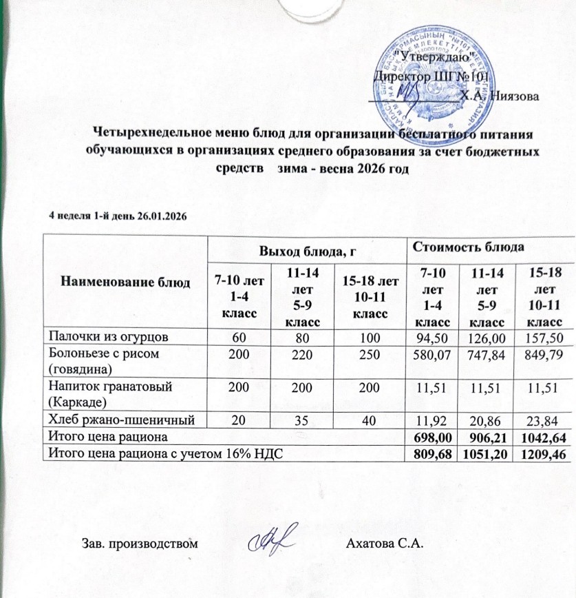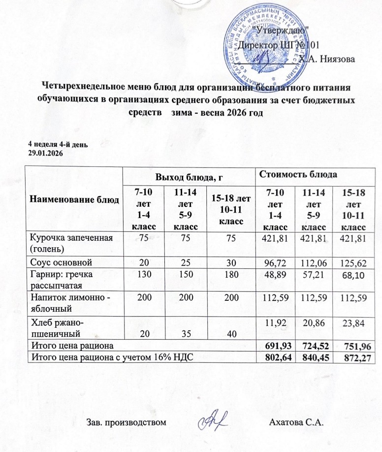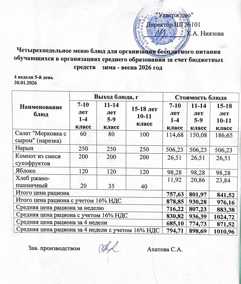 Ас мәзірі 26.01.-30.01.2026ж » КГУ "Школа-гимназия №101" Управления образования г.Алматы