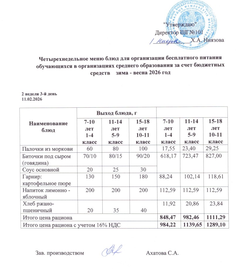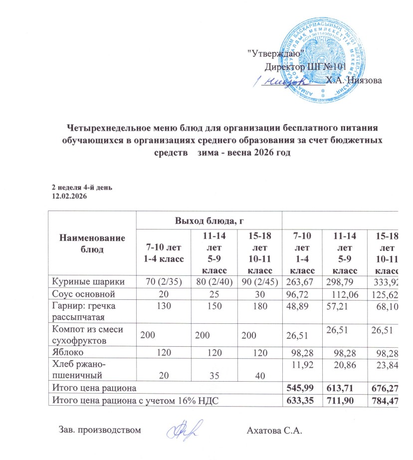 Ас мәзірі 09.02.-13.02.2026ж » КГУ "Школа-гимназия №101" Управления образования г.Алматы