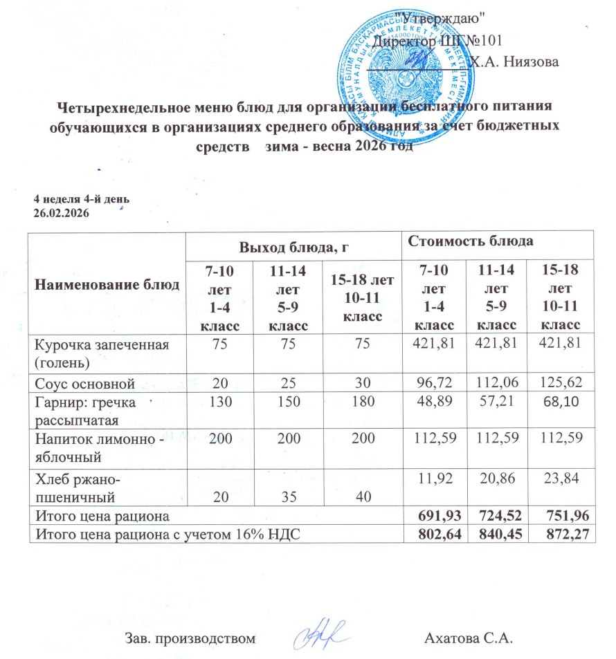 Ақпан айы 4 апта 4-күн ас мәзірі. » КГУ "Школа-гимназия №101" Управления образования г.Алматы
