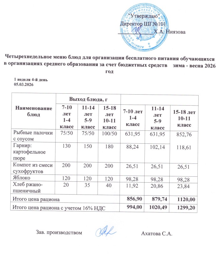 Наурыз айы 1 апта 4-күн ас мәзірі. » КГУ "Школа-гимназия №101" Управления образования г.Алматы